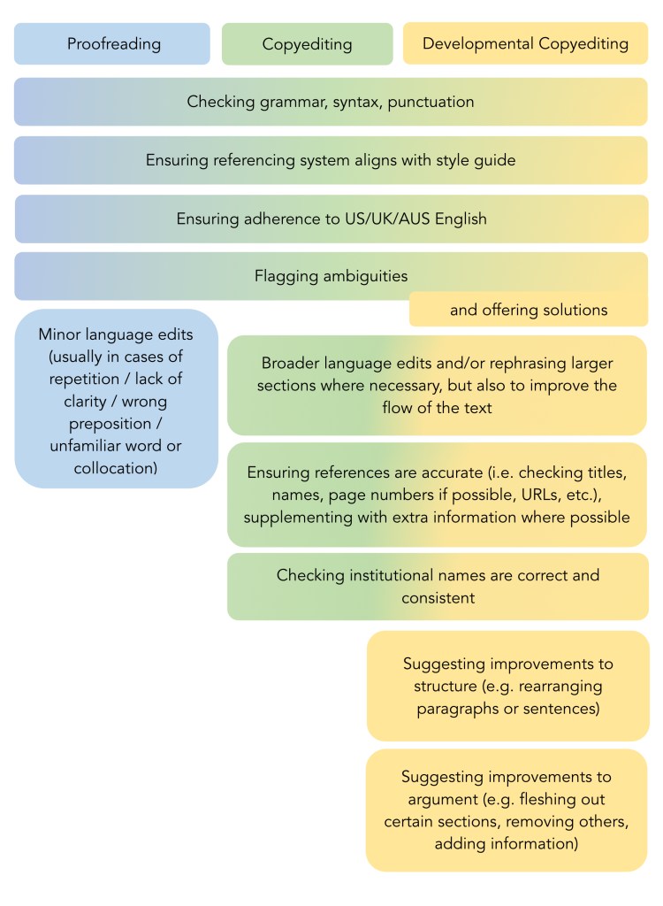 Perhaps you’re amazing at formatting references, and you just want me to check your language; or maybe you want feedback on the structure of your paper, but time or budget constraints don’t allow for a proofread alongside this? The blocks below show the level of intervention that each type of edit involves, but you can also pick and choose from these modules as needed.